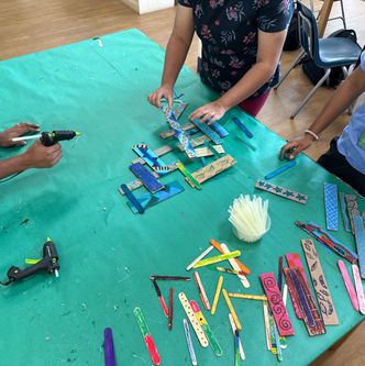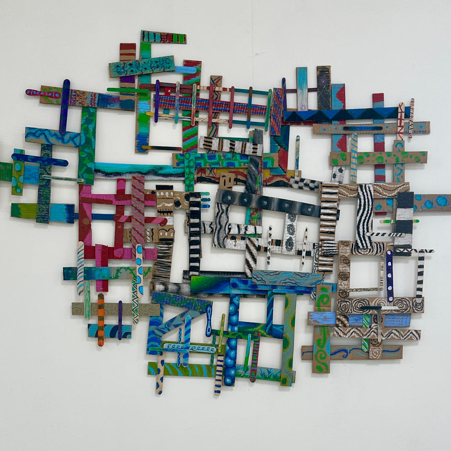 The Collaborative Tapestry Project was inspired by Ghanaian artist El Anatsui, known for his large-scale works made from repurposed materials. In this version, members of the school in Ghana decorated popsicle sticks and cardboard with oil pastel patterns. These pieces were then assembled with hot glue into intricate, mosaic-like tapestries, reflecting both individual creativity and collective effort, while celebrating a cultural appreciation for bold patterning and the influence of contemporary Ghanaian artists.